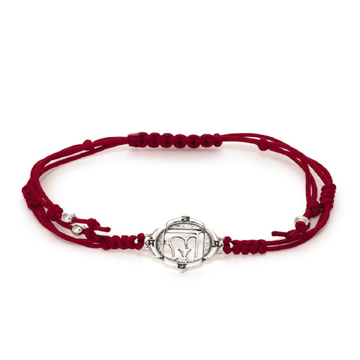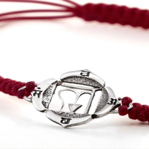 Modernes Chakra Schmuckdesign für das 1. Energiezentrum: handgertigtes Muladhara Symbol verbunden mit einem handgeknüpften Freundschaftsband aus langlebigen, strapazierfähigem Nylongarn in Dunkelrot. Das Chakra Armband WurzelChakra ist individuell größenverstellbar und den Abschluss des Armband zieren 4 kleine Silberkugeln.