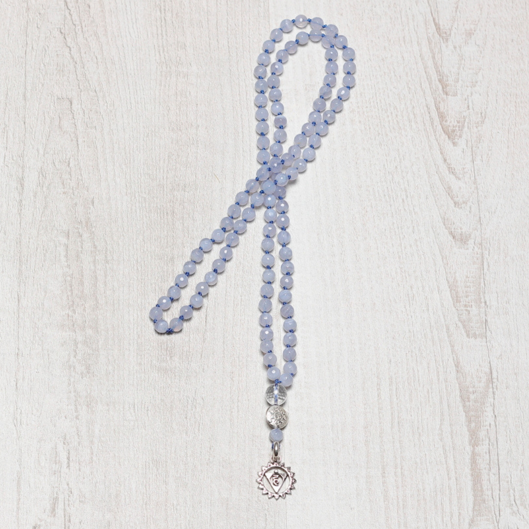 Handgeknotete Edelstein-Mala aus hellblauem Chalcedon mit Vishuddha Chakra Anhänger.